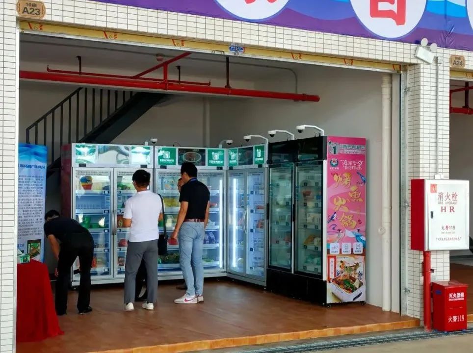 在中心的24小时水产交易市场区内,预制菜手信一条街的40台智能化预制菜自动售卖机成了热点,吸引来自天南海北的客商的目光,柜中摆放着琳琅满目的预制菜产品,有酸菜鱼,有烤鱼,还有裹蒸粽……“这些自助售卖机有两种温度设置,可适应不同菜品储存要求。”肇庆水产综合市场总经理何添祥说。