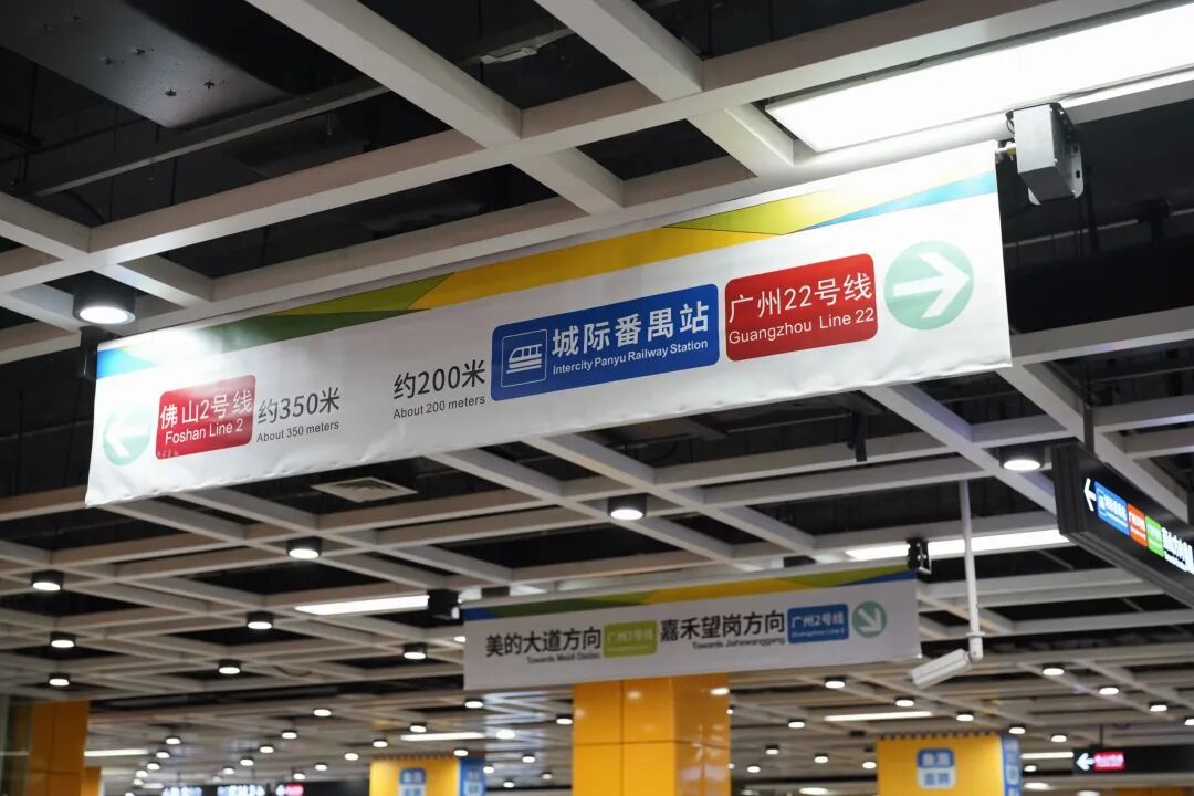 四线换乘怕迷路?安排!地铁广州南站全新升级导向系统,精准破解复杂换乘难题~设置可灵活调整的吊顶易拉宝指引,仅显示关键信息,同步增加走行距离,跟着导向走不迷路!