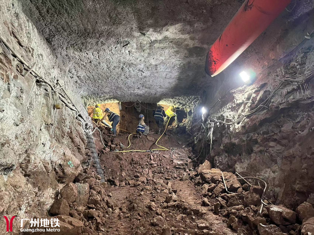 仓边路站位于越秀区东风中路与小北路交叉口正下方,为二层标准岛式车站,车站全长240米,车站标准段宽22.6米,车站结构顶板埋深约12.2米。由于施工现场周边高楼林立、地下管线复杂、地面交通车流量大,且工程地质、水文地质复杂,为降低施工对市民出行的影响,确保施工期间地面交通不中断,地铁建设者们通过多轮论证,决定在车站建设中采用拱盖法施工,也就是在侧旁开挖竖井,再施做横通道,通过横通道及竖井提供的地下作业空间,逐层向下开挖的施工方式。虽然拱盖法施工对路面的影响较小,但施工作业面狭小,给工程带来新挑战。