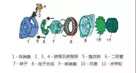 汽车交流发电机为三相同步交流发电机。转子由两块爪极、磁场绕组、铁芯和集电环组成。
