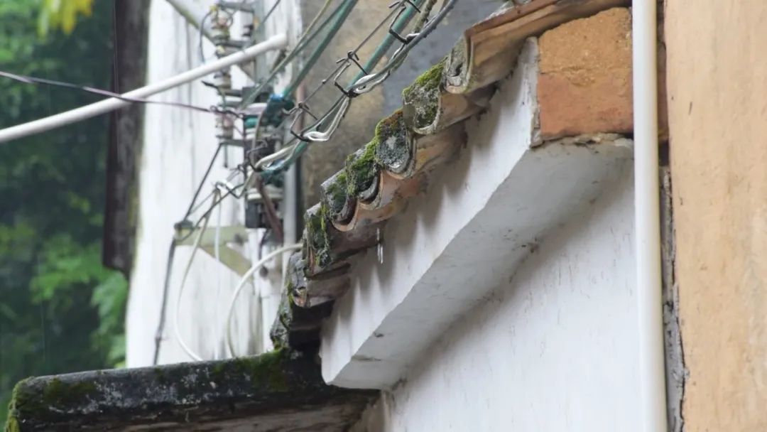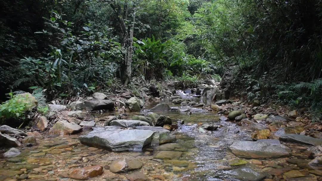 湿漉漉的树叶纷纷飘落在水汪汪的岩石上,