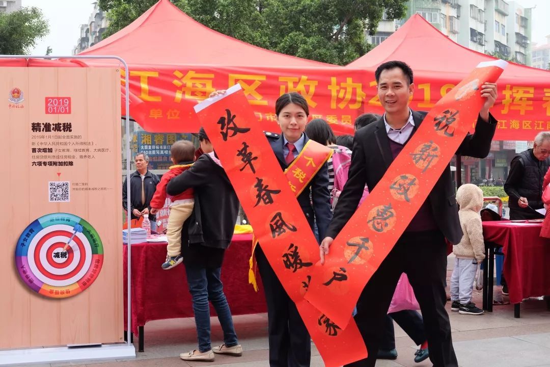 江海区的税务干部与党员义工走进社区广场,在春节来临之际,为群众送个税政策、献新春祝福。活动现场,更有个税改革受惠群众有感而发、挥毫泼墨,通过年味浓浓的对联为国家政策点赞。