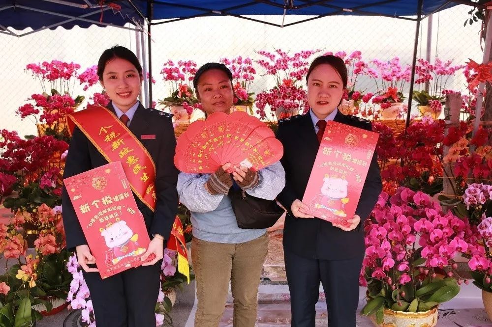 ▲税务人员为花市摊主派发充满年味和税收元素的个税利是封。