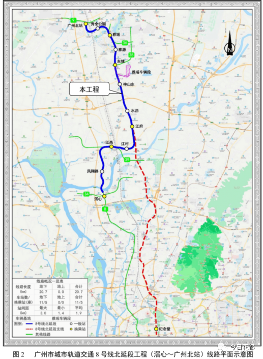 广州市城市轨道交通8号线北延段工程(滘心~广州北站)线路长约 20.7km,途经白云区、花都区。