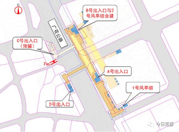 车站共设4个出入口(C出入口预留),2部无障碍电梯,其中 1号无障碍电梯与B出入口合建,2号无障碍电梯位与D出入口合建,车站附属均位于广花公路东西两侧。