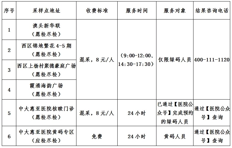4月2日,记者从大亚湾开发区获悉,大亚湾区“愿检尽检(自费)”核酸检测采样服务点如下: