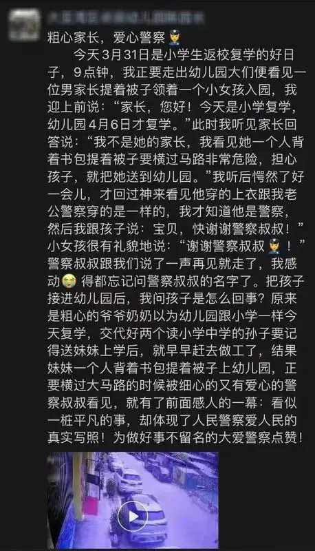 当天晚上,陈老师发了一条朋友圈将这个故事记录了下来,“粗心的家长以为今天幼儿园复学了,结果小女孩一个人准备横穿马路时被警察遇到了。一桩平凡事,是人民警察爱人民的真实写照!”