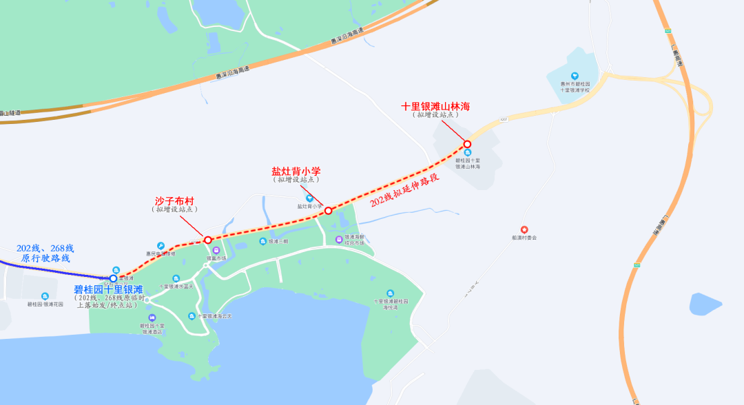 1、将原大亚湾202线【澳头滨海公园(澳头港)——碧桂园十里银滩】起讫点一端,沿石化大道东往惠东方向延伸至惠东碧桂园十里银滩山林海。