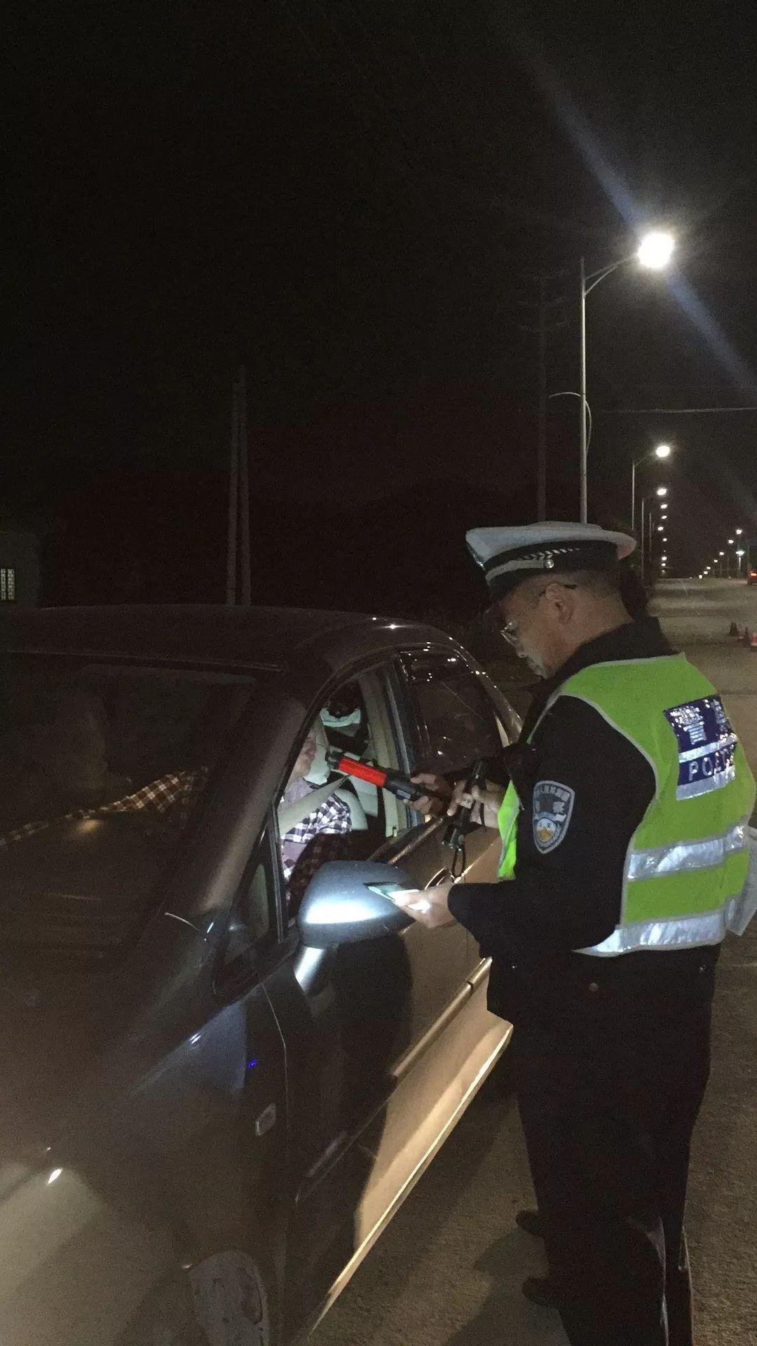 民警对一名驾驶员进行酒精检测