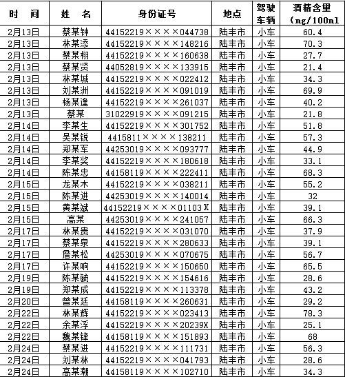 2.11-2.24期间公安交警大队查获酒驾人员资料明细