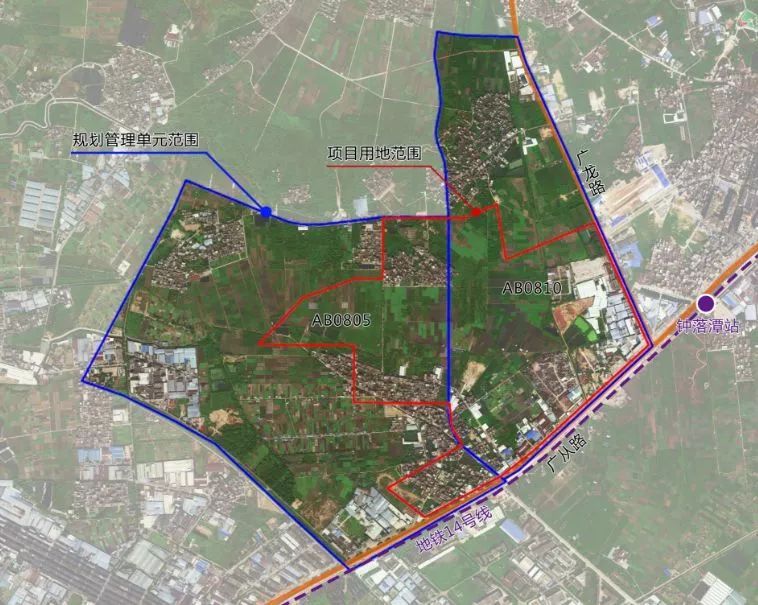 现状示意图显示,该项目调整范围临近地铁十四号线,靠近钟落潭站,范围内由大量绿植、农田构成,并有大量村民自建房及工厂。