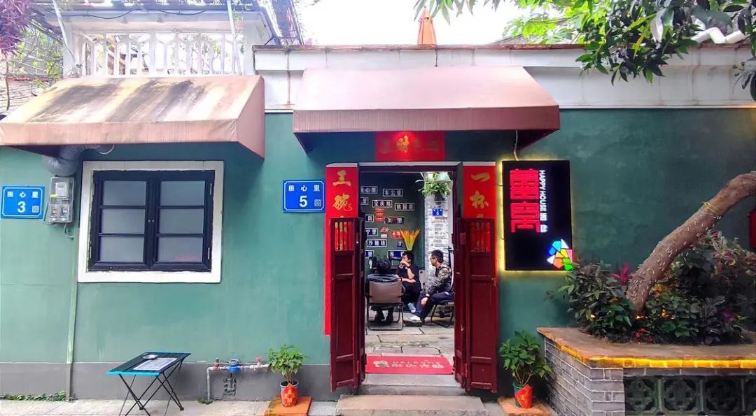 站在贴在大红对联的窄门处,推开朱红色的樘栊门,便是一个岭南小院子,映入眼帘的墙壁上贴满了类似“宝庆坊”“车公巷”“常宁里”等老巷子的标牌。院子不大,只容得下一张小桌与三四把椅子。