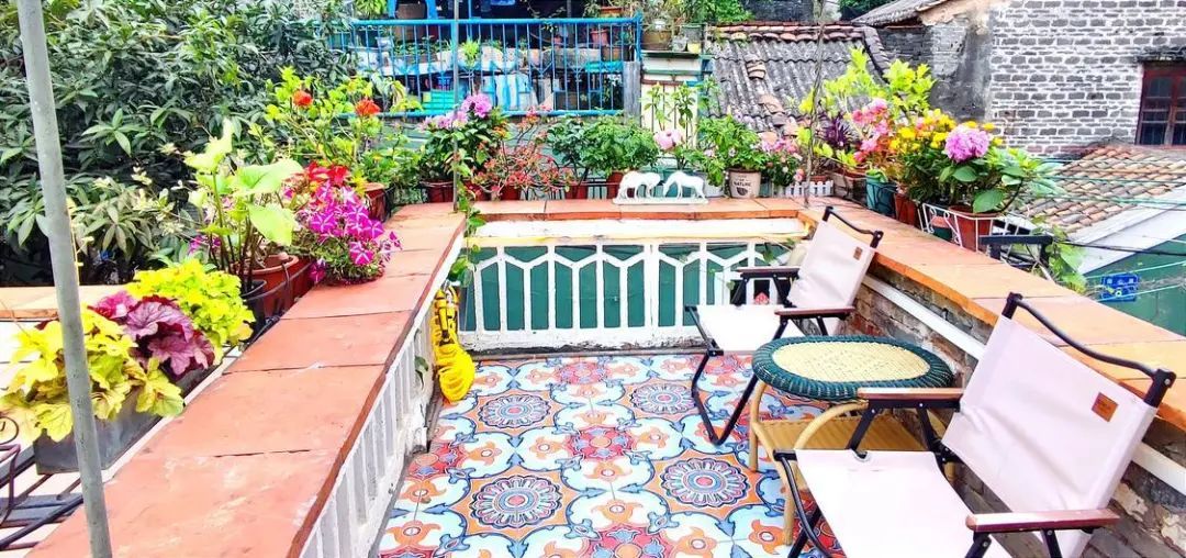这里还有一个摆满各种花卉盆栽的小露台。在露台上望去,鳞次栉比的灰塑屋顶、干净整洁的麻石街面以及青翠欲滴的树木,使得整个老宅都充斥着浓郁的岭南风情。