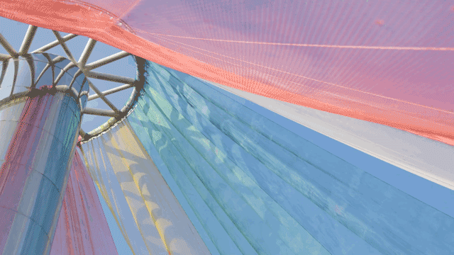 在安静的村庄与江畔肉眼可见的高速发展之间,MAD试图通过设计把“历史”和“未来”这两个时间尺度并置在一起,营造出一种超现实的场景,让人们回归想象。高耸的多媒体灯柱披上了七彩轻衣。白天,彩衣随风飘曳,清新浪漫;夜晚,多媒体灯柱成为了西江的新“灯塔”,为对岸平沙岛和西江增添了超现实的梦幻色彩。