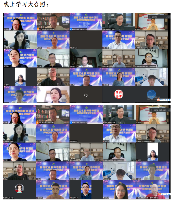 为贯彻落实名师“领航”计划,推动顺德区结对高明区紧密协作工作,顺德区教育局委托广州开放大学对区名师工作室首席主持人、新一轮省工作室主持人、新一批省特级教师等名教师开展为期一年的顺德区名教师培养项目,并于7月16-18日举行线上开班仪式暨首次培训活动。