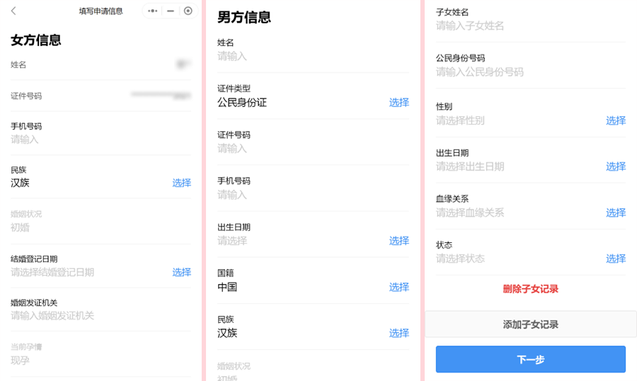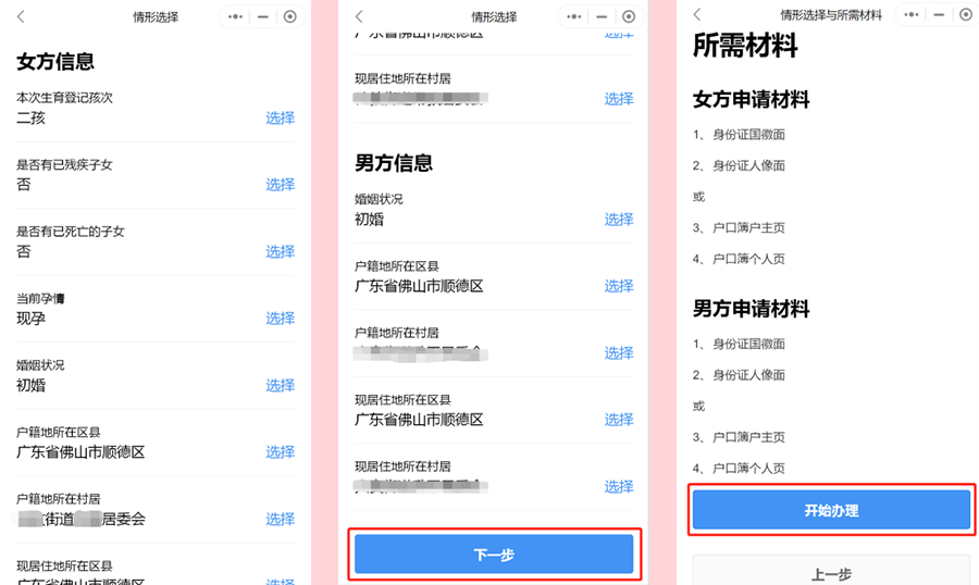 根据实际情况填写男女双方信息,点击“下一步”,准备好所需资料后点击“开始办理”。