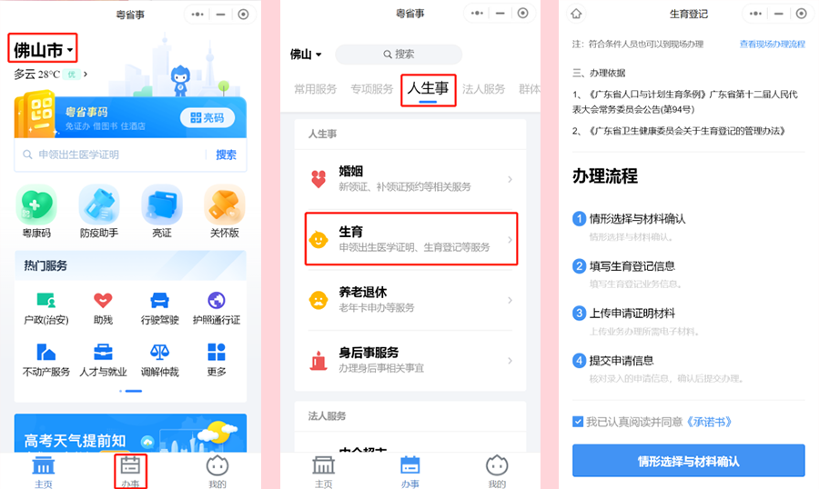 登录“粤省事”微信小程序,点击左上角切换至佛山市,点击“人生事”—“生育”—“生育登记”,仔细阅读办事指南与流程后,勾选“我已认真阅读并同意《承诺书》”,并点击“情形选择与材料确认”。