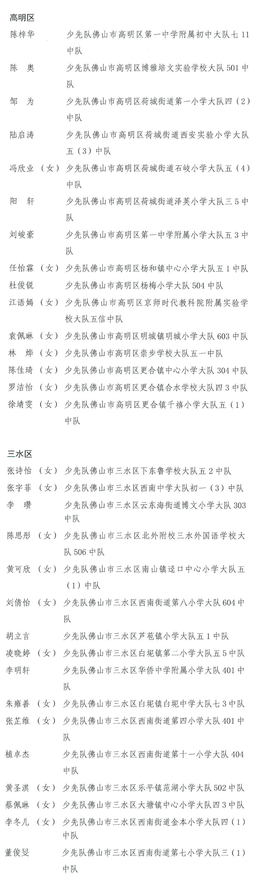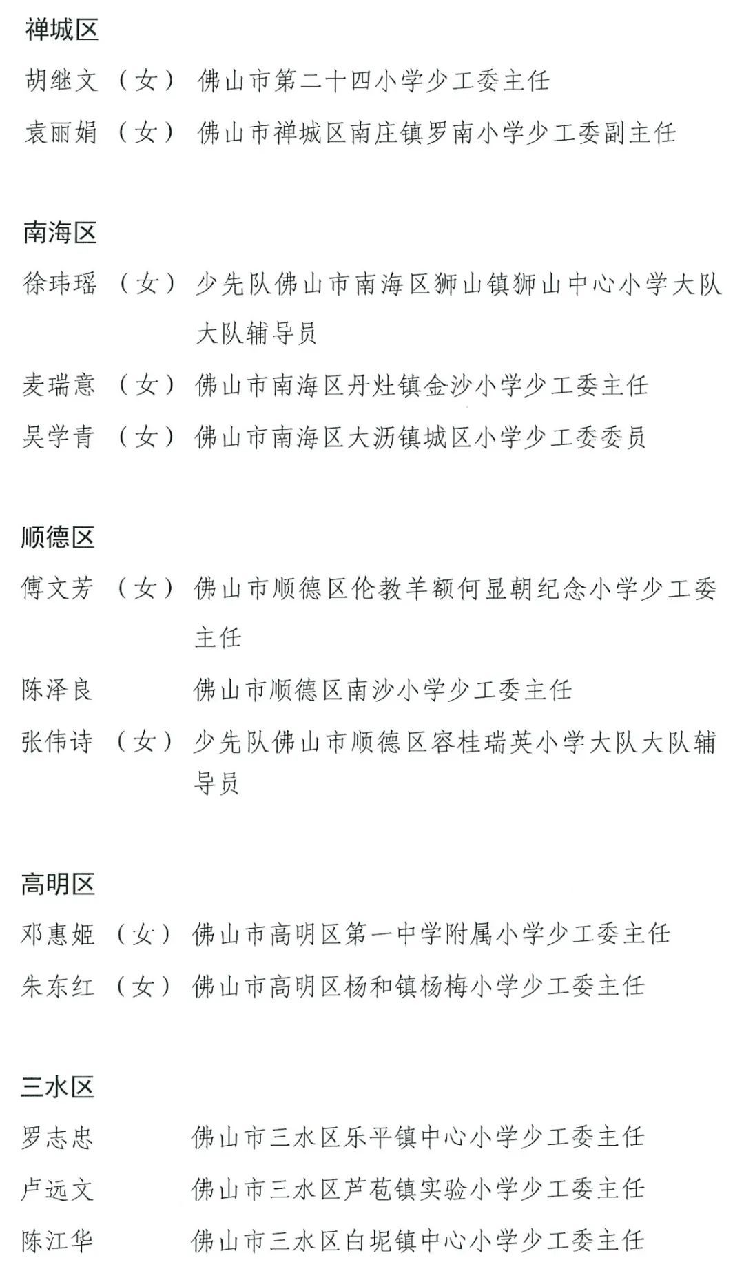 为充分发挥先进典型的示范引领作用,切实提升少先队员的光荣感,经层层推荐、市级评审和公示无异议,共青团佛山市委员会、佛山市教育局、少先队佛山市工作委员会决定——