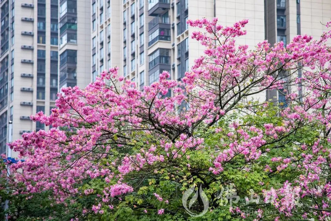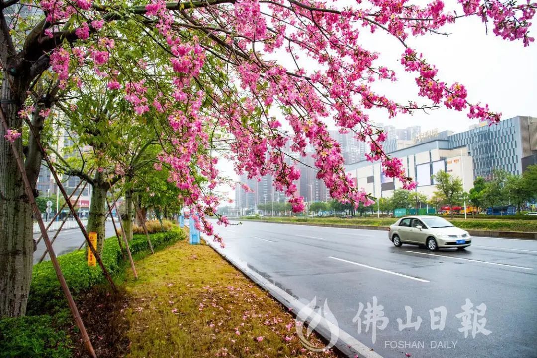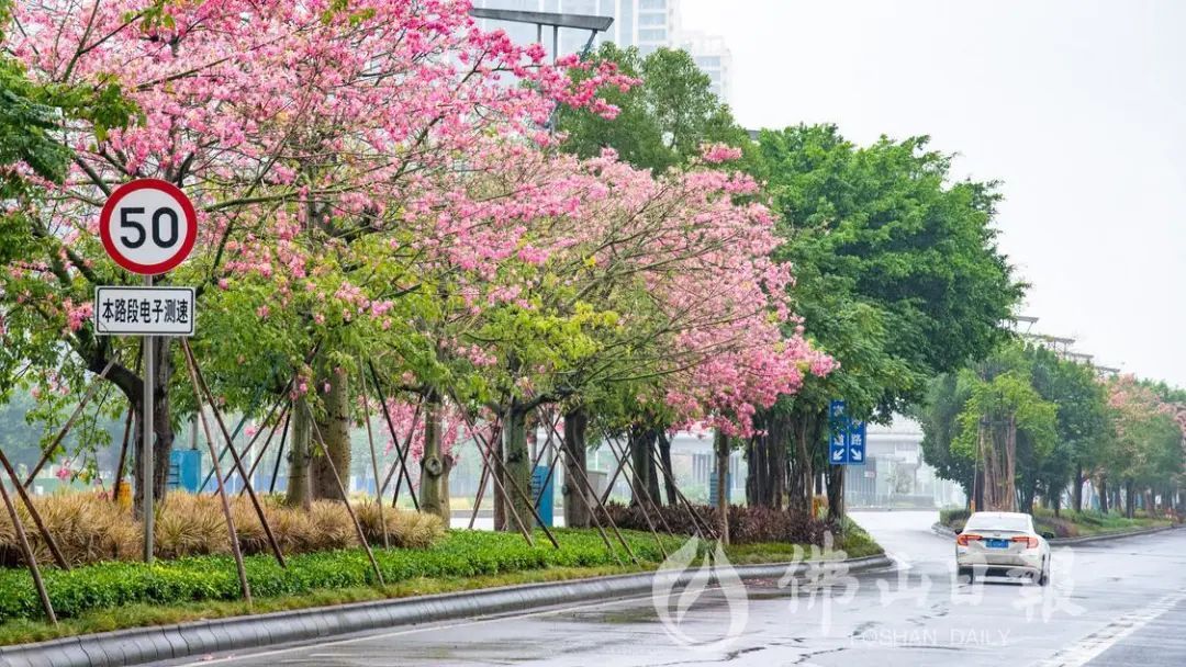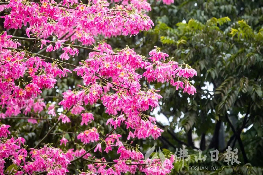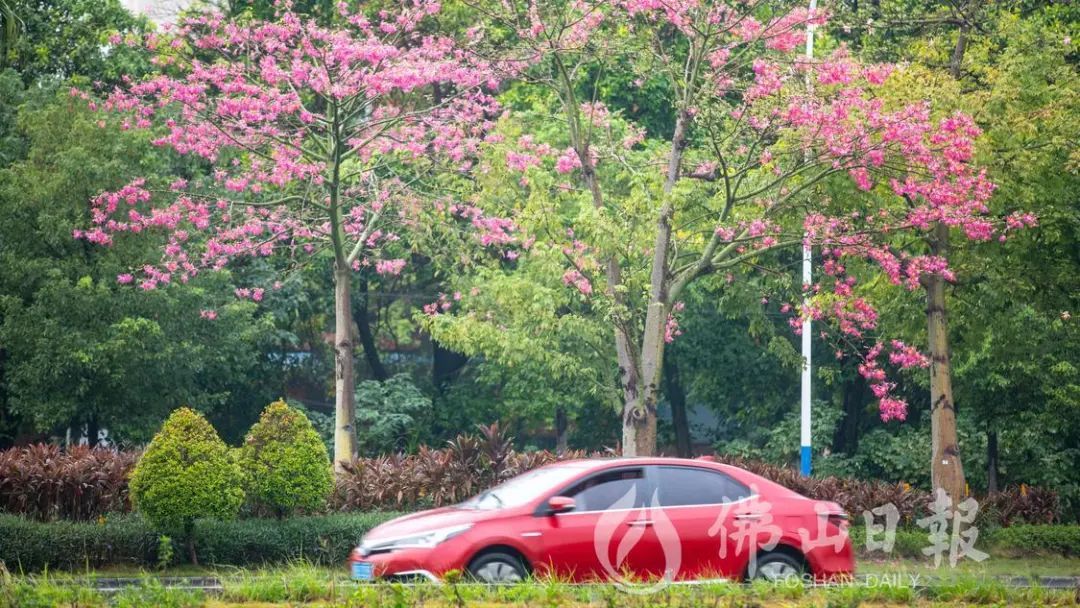 在高明荷富路,大腹木棉绽放,为城市增添了粉色浪漫。