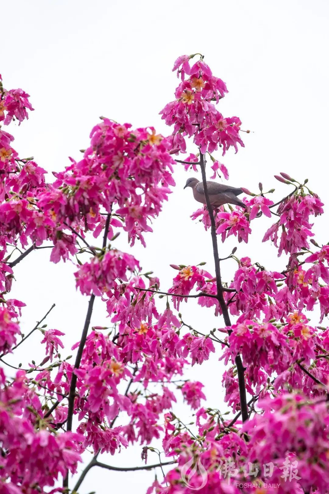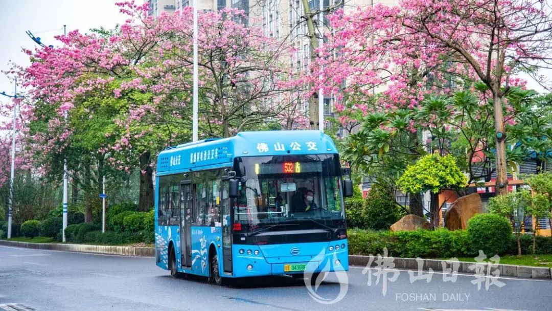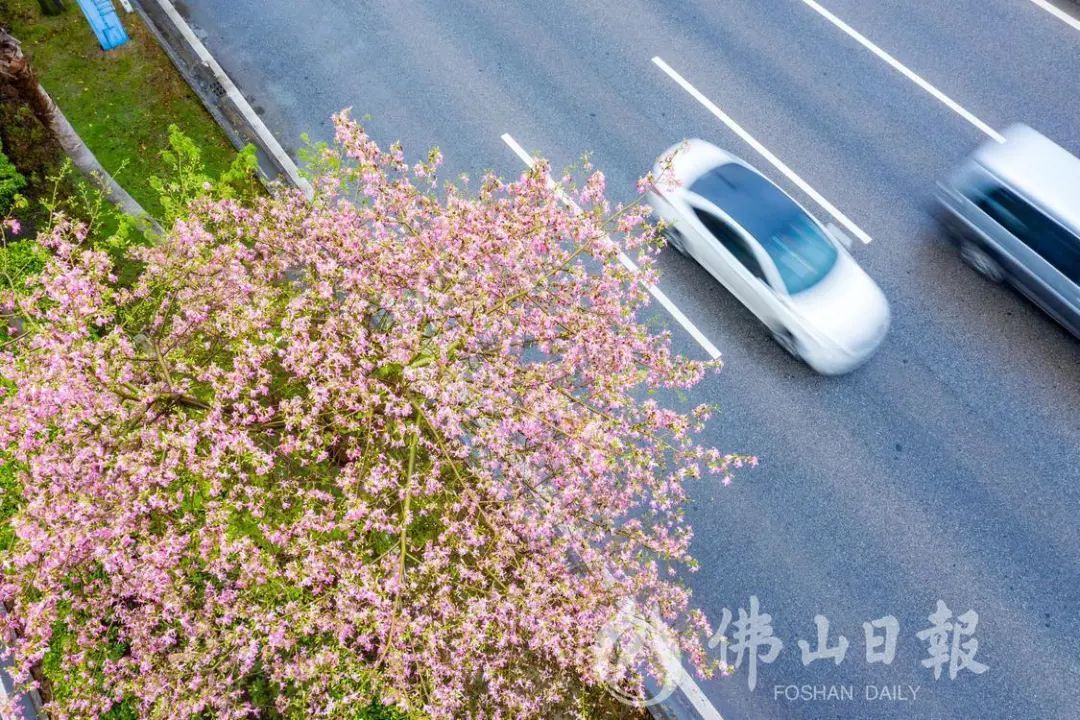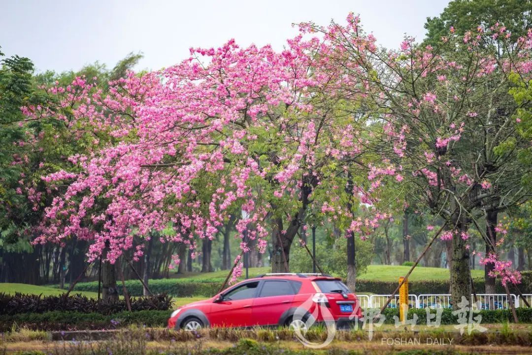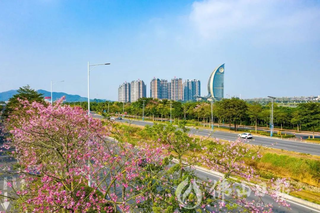 在高明荷富路,大腹木棉绽放,为城市增添了粉色浪漫。