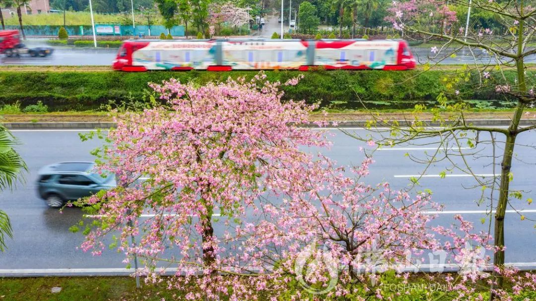 高明荷富路两侧大腹木棉绽放,高明有轨电车驶过荷富路。