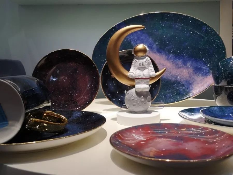而在庆发陶瓷有限公司的展位,信保小卫士第一眼就被闪闪发光的“星空盘”吸引住了目光!