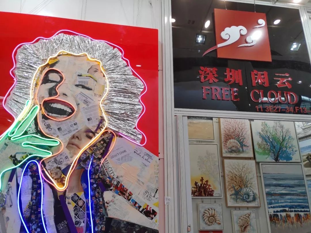 接着往前走,我们来到了珠海闲云艺术有限公司的展位,门口那幅巨大的梦露装饰壁画创新地运用多种材料,视觉冲击力满分!
