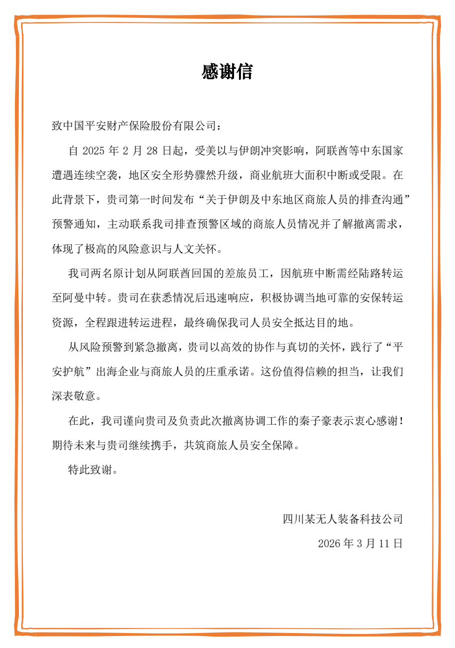 这是全国首例金融保险机构在此次中东事件中协助中国企业员工从“危险区”安全撤离的案例。据透露,两名平安回国的人员在给平安产险的感谢信中写道,“从风险预警到紧急撤离,平安产险以高效的协作与真切的关怀,践行了‘平安护航’出海企业与商旅人员的庄重承诺”。