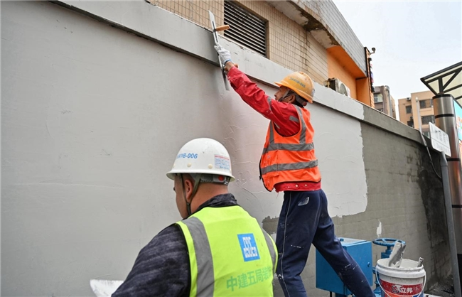 为确保墙绘效果,活动前期,服务队安排专业涂漆工人提前进场,对墙面进行裂缝填补、打磨处理,并涂刷两层白色底漆,为后续彩绘打下坚实基础。