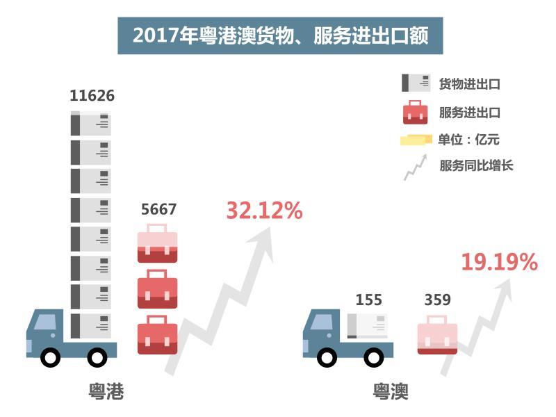 2017年粤港服务进出口5666.89亿元,同比增长32.12%,占全省比重达46.62%;同时,粤澳服务进出口358.78亿元,同比增长19.9%。
