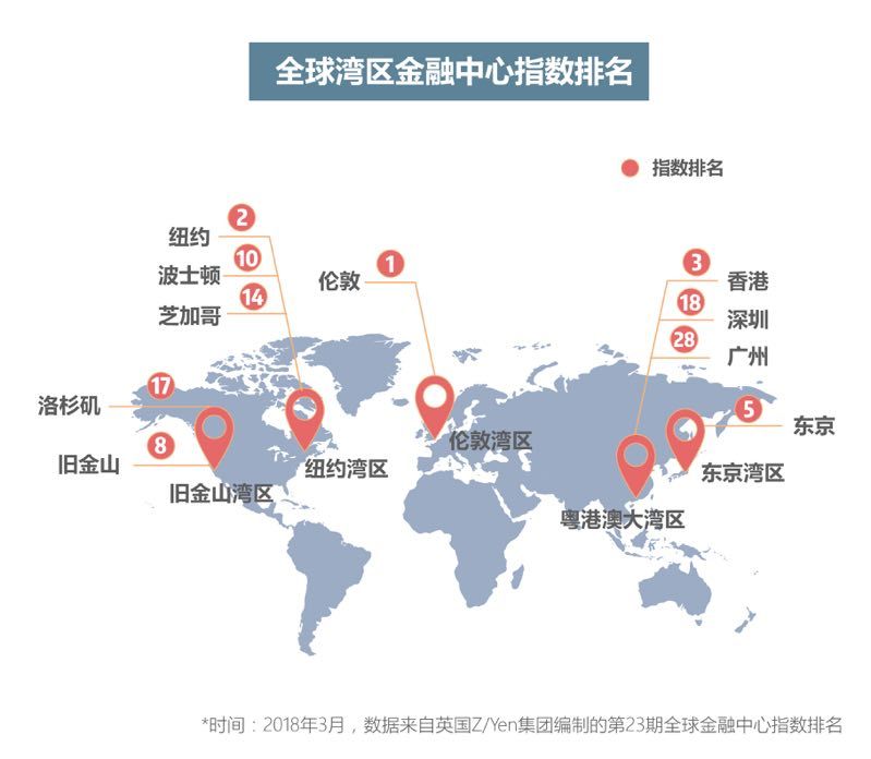 全球金融中心最新排名显示,香港是全球五大国际金融中心之一,深圳和广州分别排名第18位和第28位。2017年,粤港澳大湾区内跨境资金流动量约为4.6万亿元人民币。