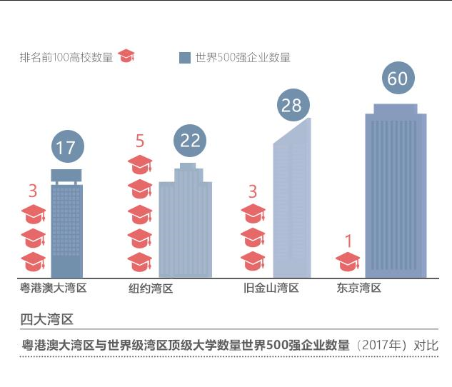 一直以来,国际顶尖高校资源被视为广东的一大短板,而联合香港科技实力,粤港澳大湾区已经在向世界一流湾区看齐。据《泰晤士报高等教育》2016—2017世界大学排名显示,排名前100的高校中,纽约湾区有5所,旧金山湾区有3所,东京湾区仅东京大学1所入围,粤港澳大湾区有3所大学上榜,与旧金山湾区持平,仅次于纽约湾区。