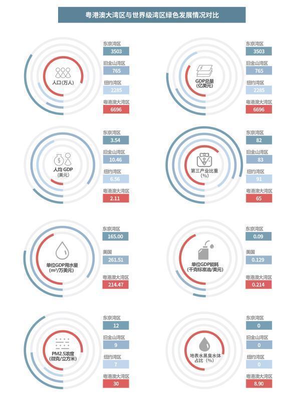 以大气环境为例,2016年,粤港澳大湾区PM2.5年均浓度为30微克/立方米,而纽约湾区约为7微克/立方米,旧金山湾区和东京湾区分别为9微克/立方米和12微克/立方米。在地表水黑臭水体这项指标上,粤港澳大湾区占比达8.9%,其他三大湾区均为0。