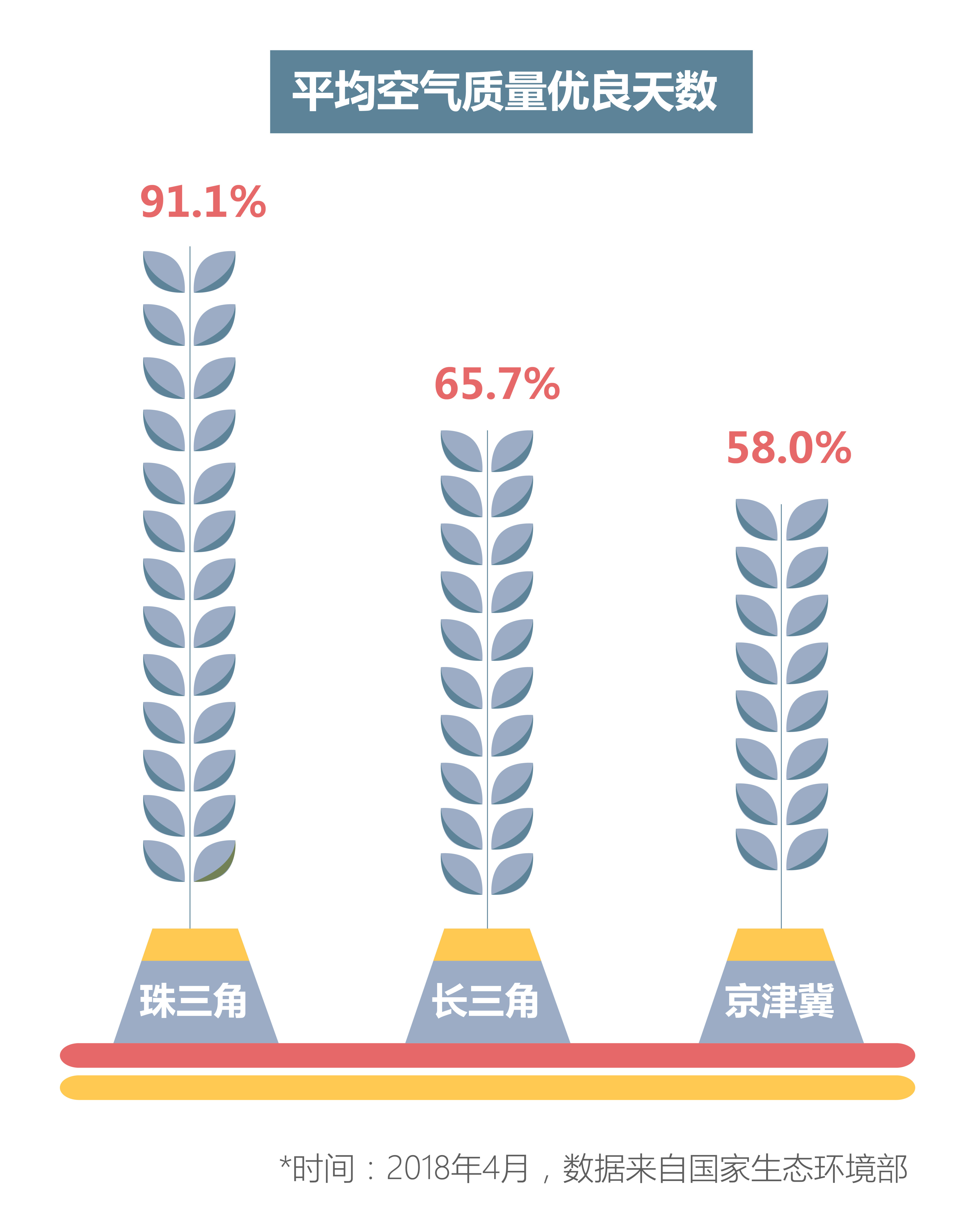 生态环境部发布信息显示,2018年4月,京津冀区域和长三角区域的平均空气优良天数比分别为58.0%和65.7%,而珠三角区域的平均空气优良天数比例高达91.1%。