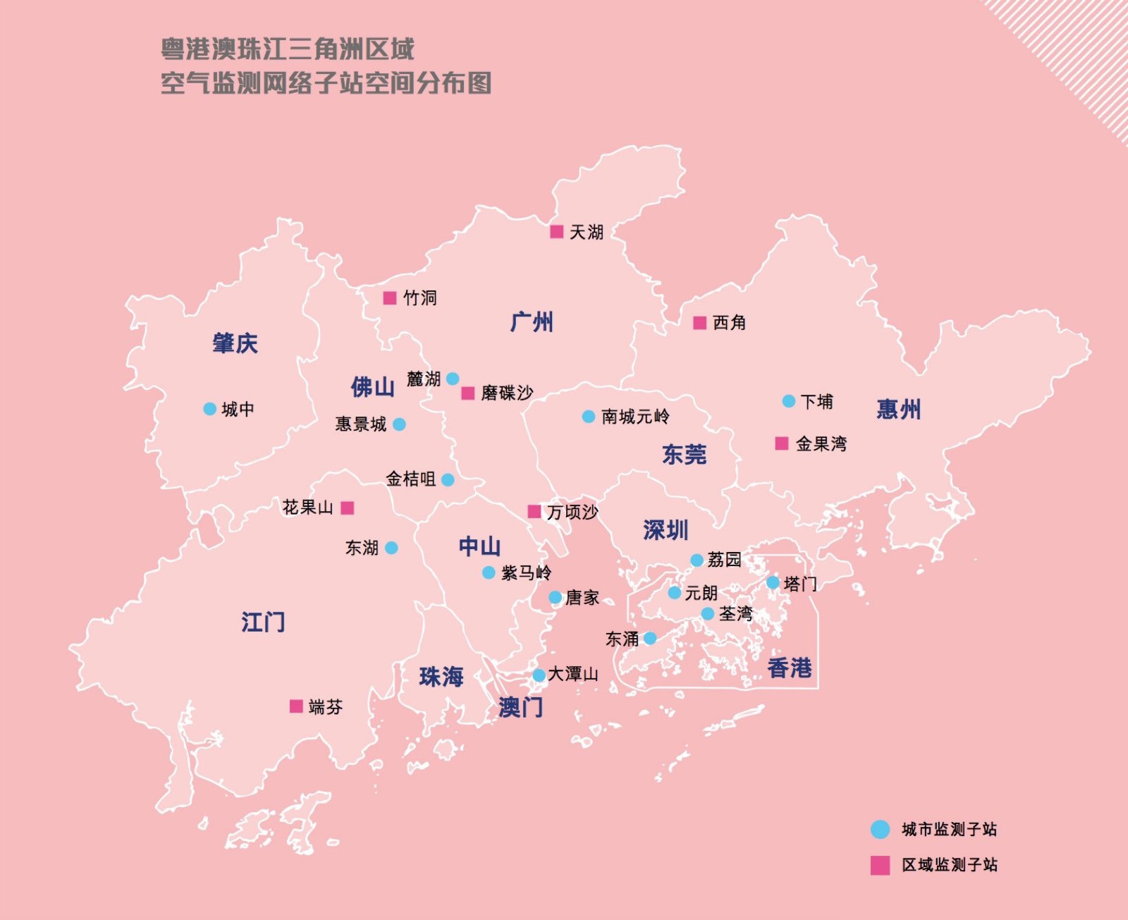 打开粤港澳珠三角区域空气监控网络,23个站点分布在广东珠三角和香港、澳门三地,公众点击地图上的对应蓝点,每个站点可以查询6种污染物浓度和空气质量指数,每小时数据以及日平均数据都一目了然。