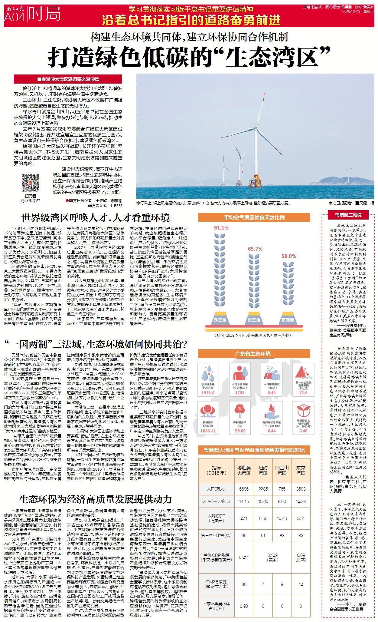 建设世界级湾区,离不开生态环境质量的支撑。构建生态环境共同体,建立环保协同合作机制,推动产业结构优化升级,粤港澳大湾区正向着绿色低碳的生态湾区积极探索,奋力实践。