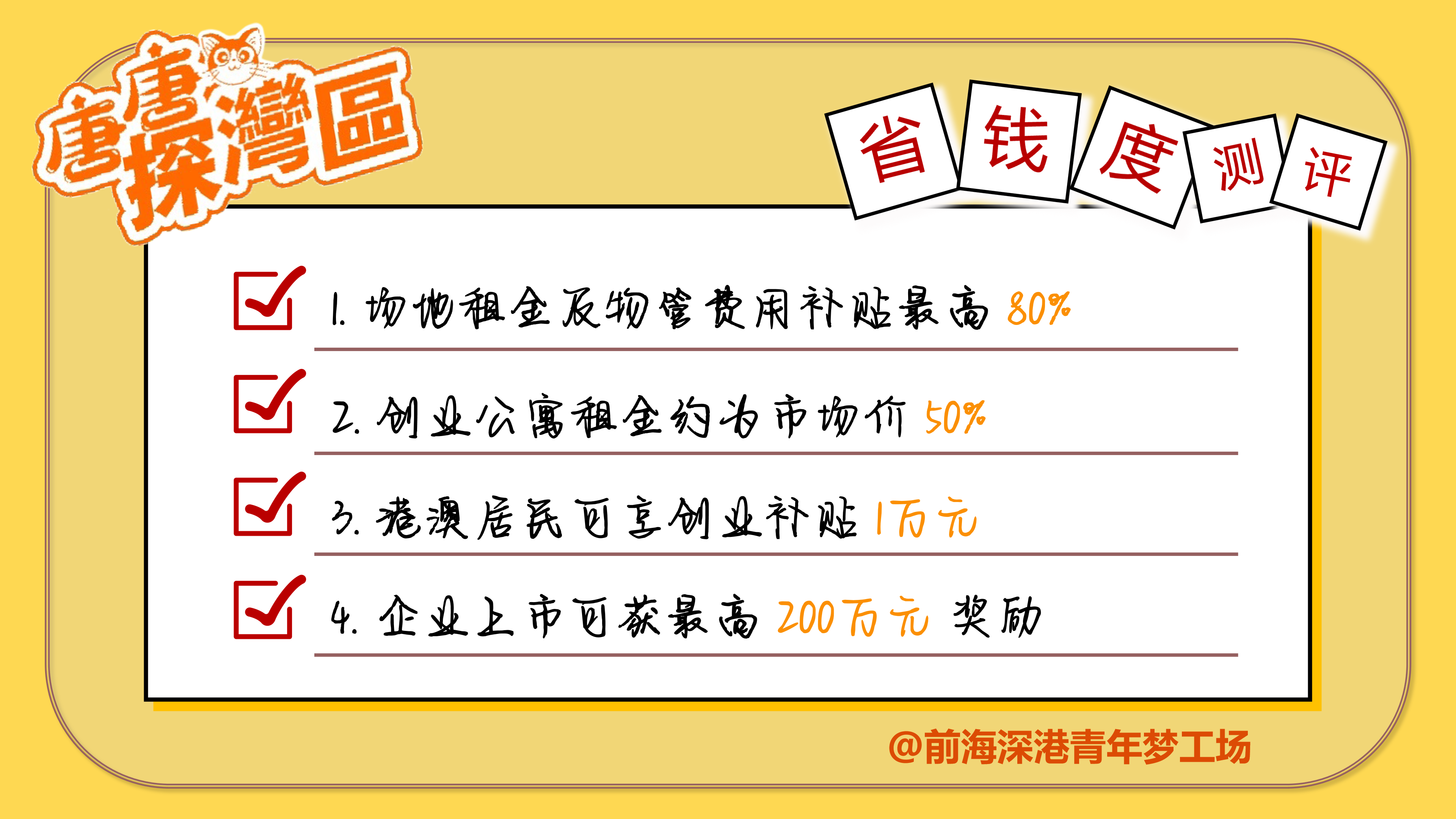 以场地租金为例。前海深港青年梦工场基准场地使用成本约115元/平方米/月,符合条件的港澳青年创业者可申请办公场地租金及物管费用补贴,第一年补贴80%,第二年补贴50%,第三年补贴20%。若申请一个100平方米的办公场地,这样算下来,第一年的租金便可以节约11万元。
