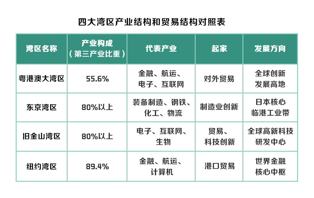 如今三大湾区已顺利进入服务经济和创新经济阶段,第三产业比重均超过80%,而粤港澳大湾区第三产业比重不到60%。