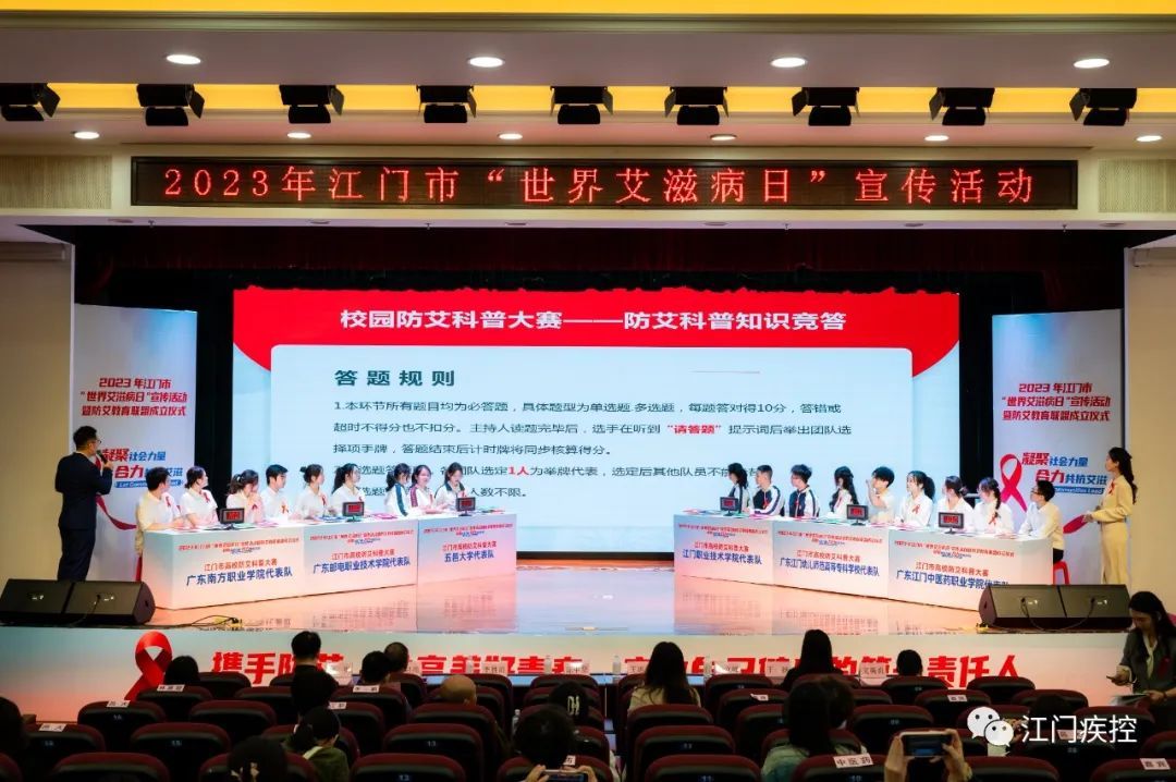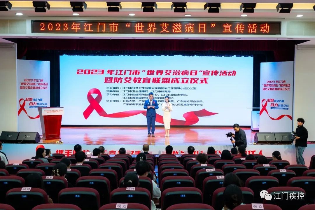 为推动江门市艾滋病防治工作高质量开展,深入宣传“每个人是自己健康第一责任人”理念,普及艾滋病防治知识和技能,12月1日下午,江门市公共卫生与重大疾病防治工作领导小组办公室联合江门市卫生健康局、江门市教育局、江门职业技术学院、江门市疾病预防控制中心、江门市理想家社会工作综合服务中心等在江门职业技术学院明德堂举行2023年江门市“世界艾滋病日”宣传活动暨防艾教育联盟成立仪式。江门市区大专院校师生代表合共200多人参与活动。