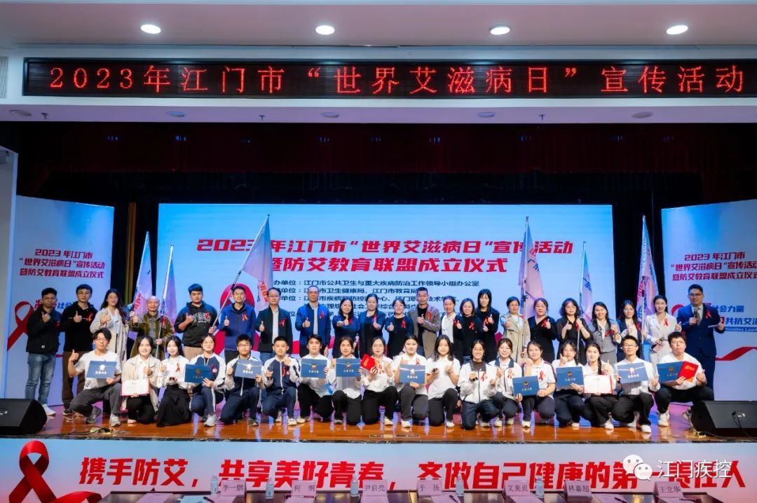 为呼吁江门市区高校切实承担起艾滋病防控主体责任,巩固现有防控成果,持续加强校园艾滋病防控工作,当天还举行了江门市高校防艾教育联盟成立仪式,江门市卫生健康局、江门市教育局代表共同为五邑大学、江门职业技术学院等6所学校授旗。据悉,本次成立高校防艾教育联盟,旨在进一步整合各方资源,助力各校拓展防艾教育工作“朋友圈”,共同构建校园防艾教育共同体,为全市校园防艾工作提供强有力的平台支撑。