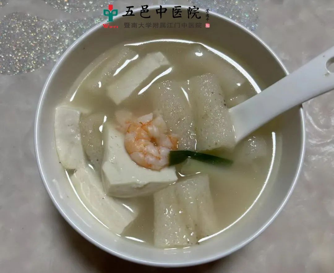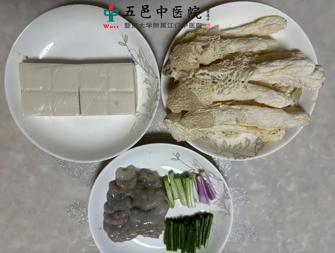 竹荪具有补气养阴、润肺止咳的作用;豆腐益气和中、生津润燥;虾可以补肾壮阳;葱可通阳解毒。