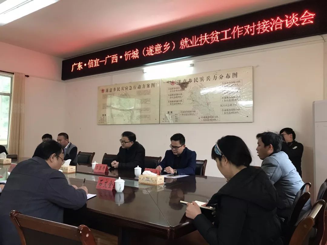 为进一步加强粤桂“携手奔小康”扶贫协作工作,12月6日至7日,信宜市委组织部副部长、市人社局党组书记、局长李戈带领信宜市人社局相关股室、单位负责人一行赴广西来宾市忻城县开展就业扶贫协作交流对接,在忻城县遂意乡建立就业服务工作联络站。