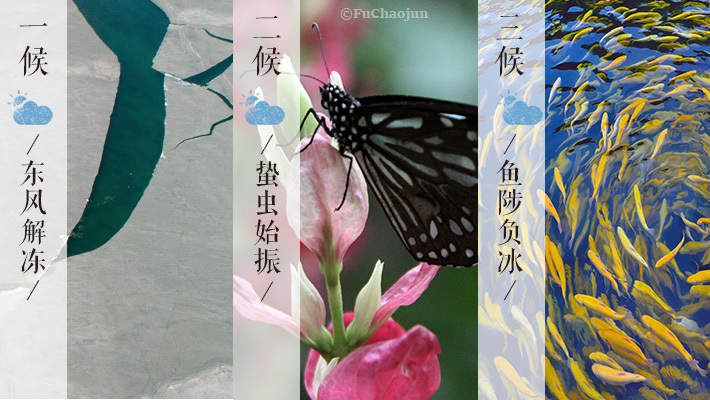 意思是,立春时节,东风送暖,大地开始解冻。立春五日后,蜇居的虫类慢慢在洞中苏醒,再过五日,河里的冰开始溶化,鱼开始到水面上游动,此时水面上还有没完全溶解的碎冰片,如同被鱼负着一般浮在水面。