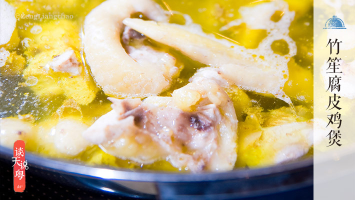 做法:将鸡斩件,焯水备用。干竹笙开水泡发10分钟,洗净。锅内加入350毫升开水,放入火腿、生姜,小火煮30分钟。再放入鸡、竹笙、腐皮煮10分钟左右,加入胡椒粉、食盐调味即可。