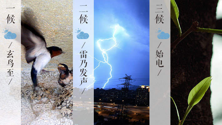 春分分三候,“玄鸟至;雷乃发声;始电”。“玄鸟”意为燕子,春意渐浓,燕子归来;“发声”,雷声作响,春笋破土而出;其后,电闪雷鸣,早已一派生机旺盛的景象。