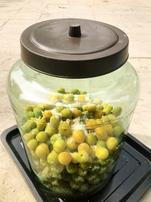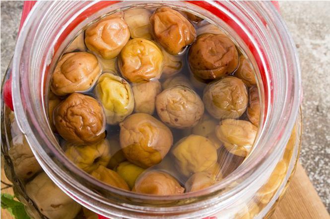 (2)腌制乌梅在超市或网上均有售,也可购买新鲜酸梅自行腌制:酸梅洗净后晾干,在洗净晾干的玻璃瓶内以一层酸梅一层盐摆放好后加盖密封,放太阳下晒至酸梅出水、盐融化后放阴凉处腌制即可。