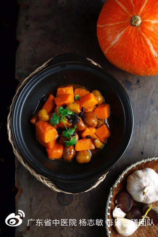 栗子,如板栗,《本草备要》载:“(性)咸温,浓肠胃,补肾气”,是上等果品,具有养胃健脾、补肾壮腰的功效。大蒜,有健脾胃、祛湿浊、消肉食的作用。南瓜性温味甘,能润肺益气,化痰、疗便秘。辛温的蒜子搭配温养的栗子和南瓜,成就了一道补而不滞的素食,能增食欲、补脾肾。