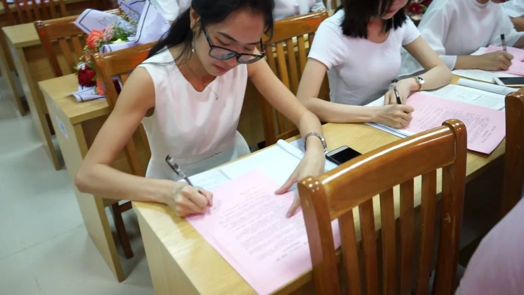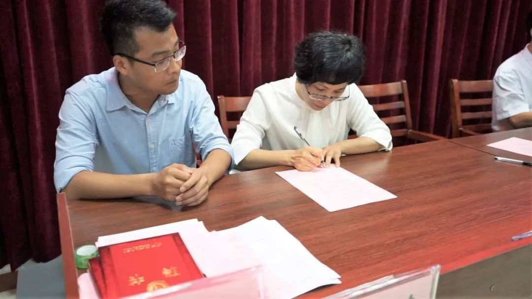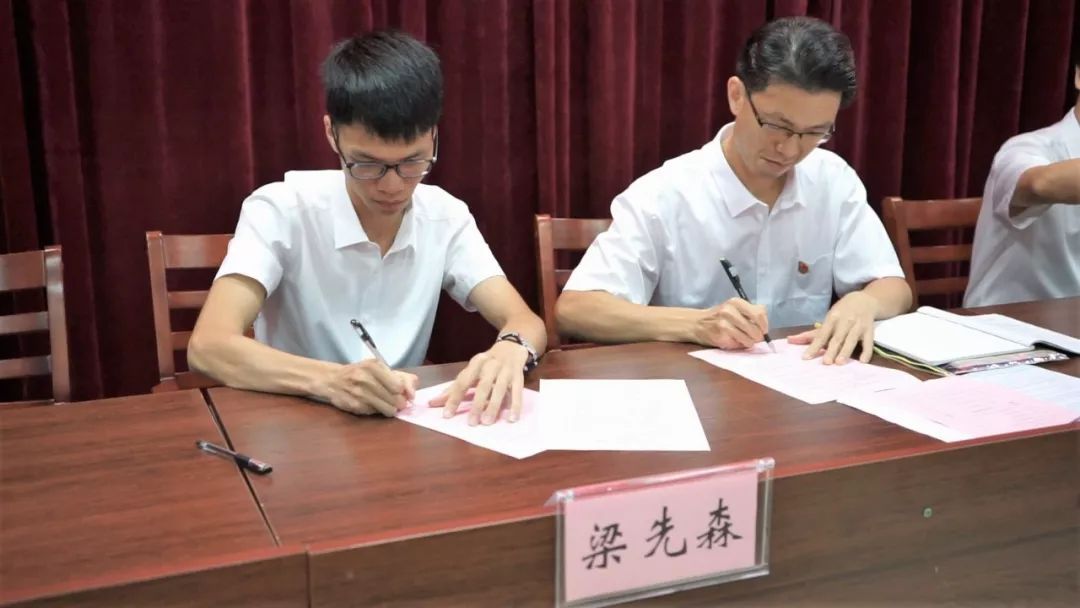 紧接着师徒签订结对协议,梁先森、朱焕全两位老师作为“徒弟”代表,梁家伟、梁海娣两位老师作为“师傅”代表,郑重在主席台上签名,其他老师则在座位上签名。这份协议,凝聚着师傅们对徒弟们的一份份嘱托,也包含着徒弟们对师傅们的一份份信任。