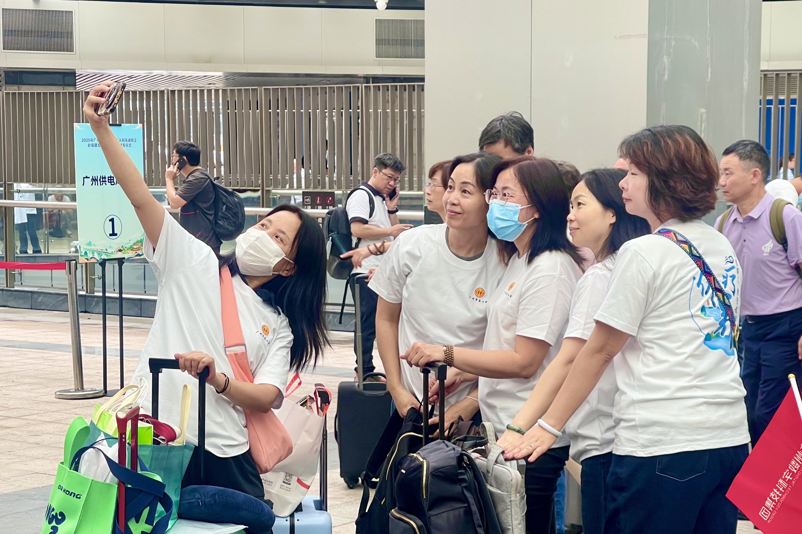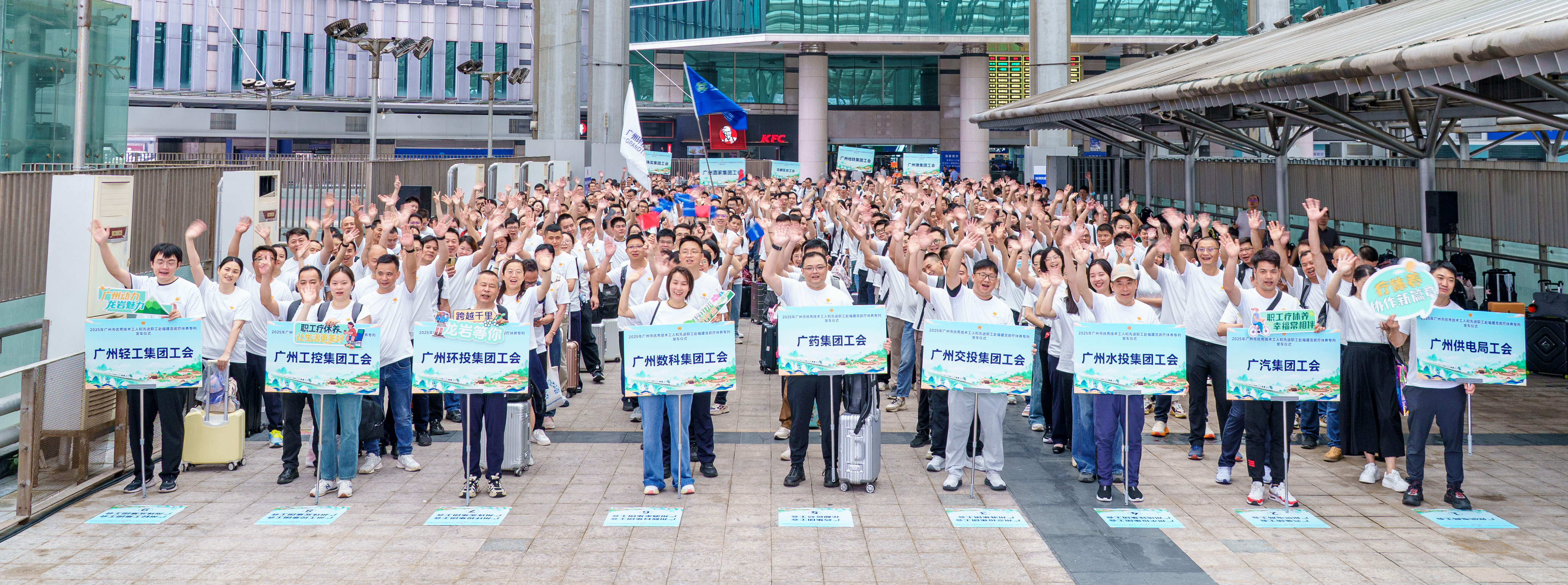 650余名来自全市各行各业的一线劳动模范、技术工人和先进职工代表齐聚广州东站,他们将搭乘专列奔赴闽西革命老区,踏上五天四夜的疗休养之旅。
