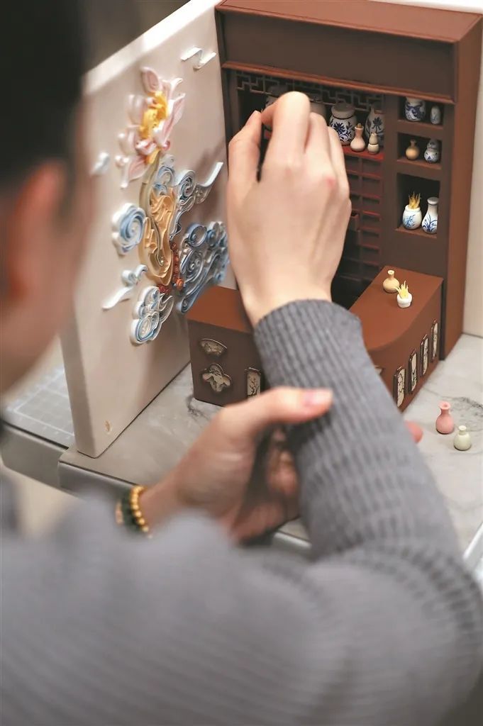 陈奕园介绍,整个蛋糕最难的是装饰小,细节多,细节越做越多,最后将抽屉也做成可以抽动的,前后花了两个星期才制作完成。“很多小物件保留了它的可移动性,因为想要给大家呈现更多趣味性,锅盖、碾药器、研磨器还有14个抽屉都是可以移动的,晒药架晾晒的是陈皮和广佛手。算盘珠子太小了,只能用镊子来拨动。”陈奕园介绍,中药柜上面药方开的是四君子汤,对应中药柜四周的水墨画、梅兰竹菊壁画用翻糖模仿衍纸的工艺制作了佛手池莲。中药柜上面的抽屉都是可以抽动的,里面都是放了相应的中药药材。“可能是因为这些可以活动的小装饰赋予了整个作品灵魂和乐趣,才能拿下金奖。”